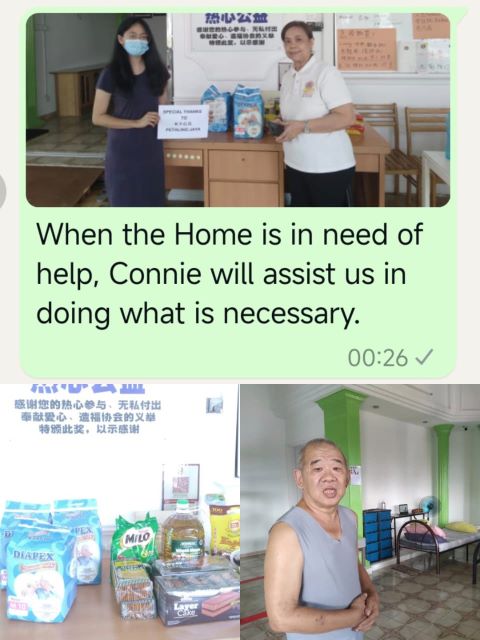 1. In response to an appeal from a shelter home that cares for elderly residents who are single, without relatives, and unable to manage their own expenses due to becoming unemployable in their 70s and 80s and requiring geriatric care, these aged citizens found a place at the Sentosa Charity Home. One resident at the shelter is 105 years. Connie delivered diapers, oil, biscuits, & items suitable for the aged on our behalf. The Home operates with funds from the Welfare Service, the aid the elderly residents receive from their social welfare allocation, and from good Samaritans. On occasions when they face difficulty making ends meet, they appeal to us for assistance.