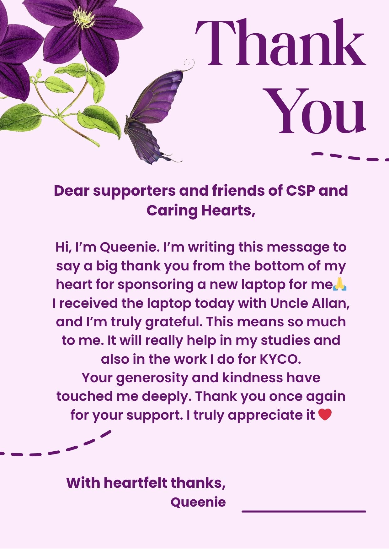 Dear members, given below is the 'thank you letter' from Ms Queenie who has received a new laptop for her Varsity use: