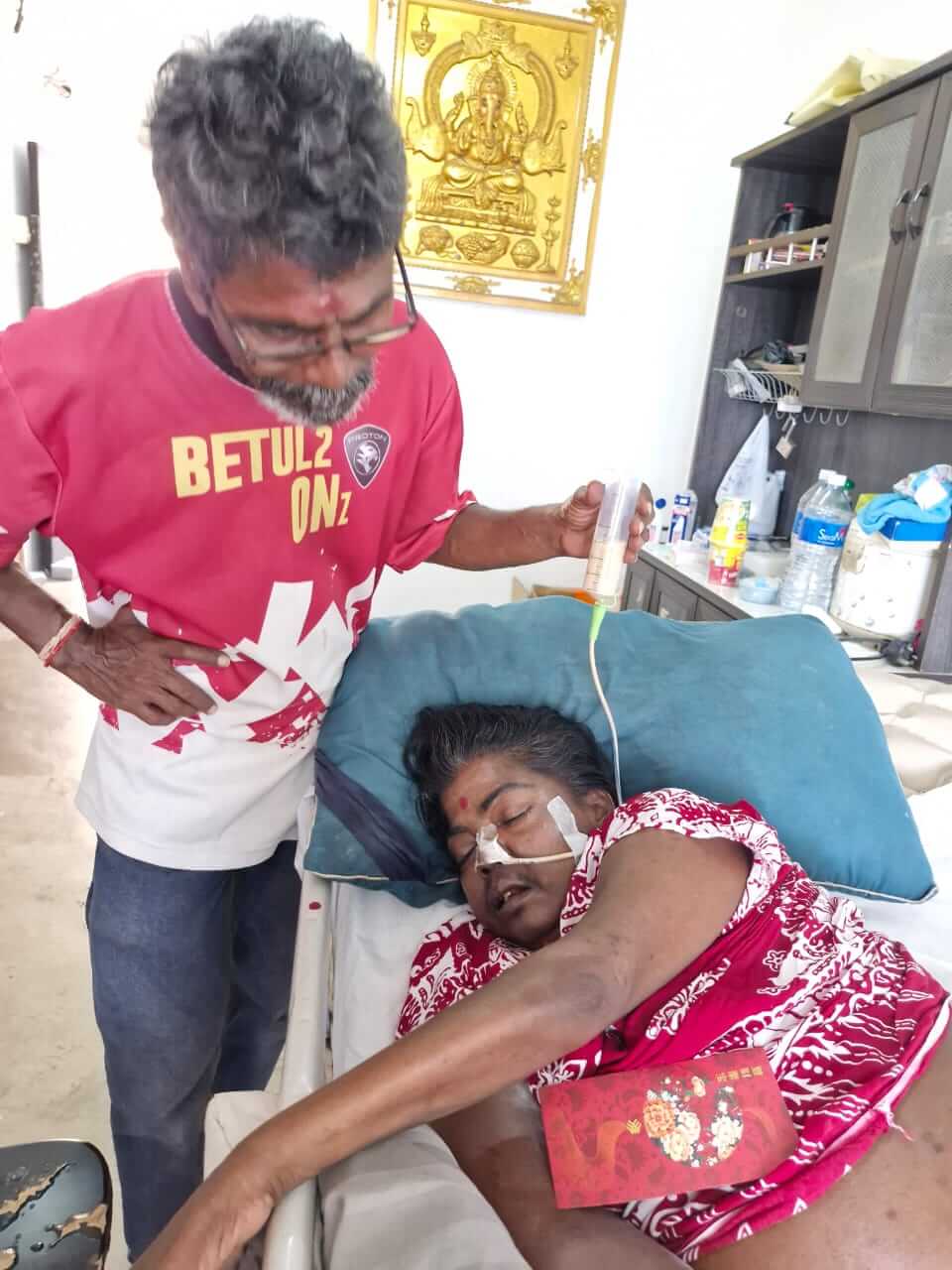 👇1) Mariayee, bed ridden stroke patient feeding on only RenoMed High Protein Milk from tube through her nose with husband who stopped work to take care of her.