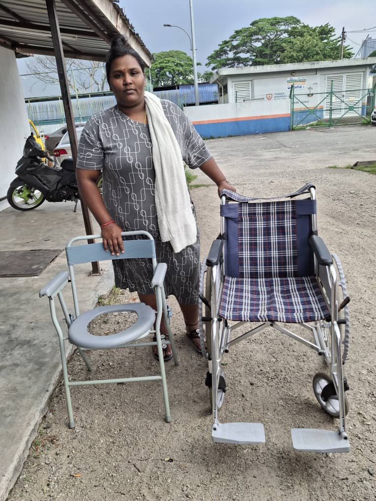 Visit on14/10/25 to Viki. Lady on wheel chair is Vicki's mother who had a fall n fractured her right leg. This wheelchair is given to her to replace the earlier one.